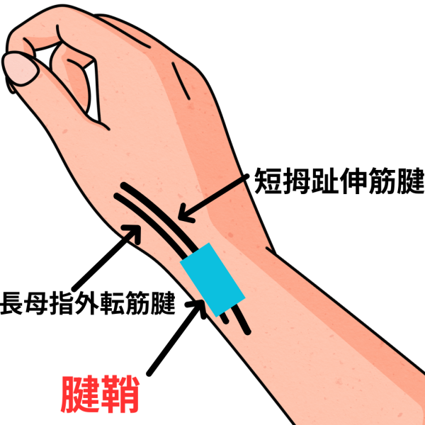 腱とは、筋肉と骨をつなぐひも状の組織のこと。そして腱鞘とは、腱を包んでいるトンネルのようなもので、この憲章の中には長母指外転筋腱と短母指伸筋腱が通っています。これらの腱は腱鞘の中をスムーズにスライドしながら、指や手首を動かします。