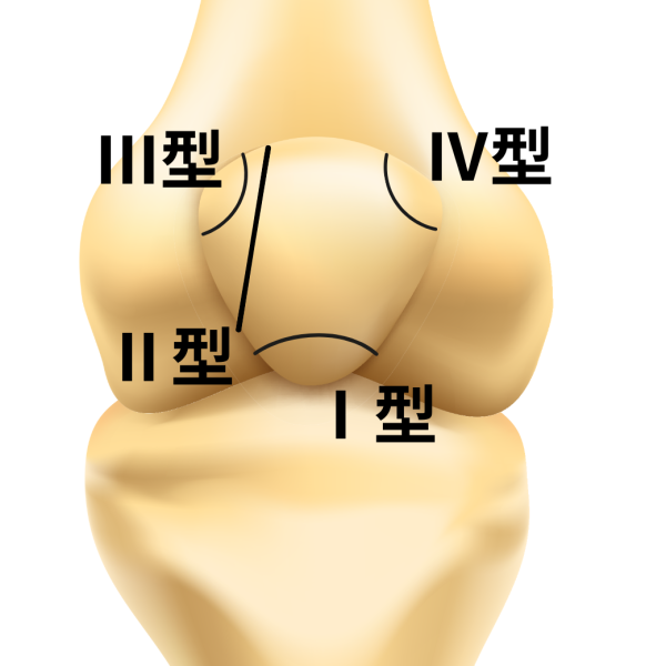TypeⅢ(外側上極型) 膝蓋骨の外側上部で分裂が起きているタイプです。3つのタイプの中で最も多く、全体の約75%を占めるとされています。有痛性になりやすいのもこのTypeⅢが最も多く、膝のお皿の外側上部を押すと痛みが出る場合はこのタイプが疑われます。